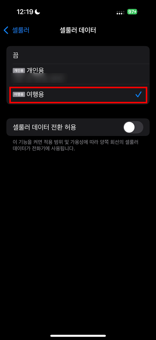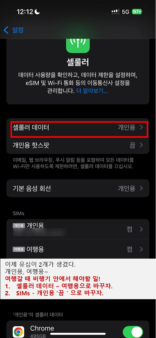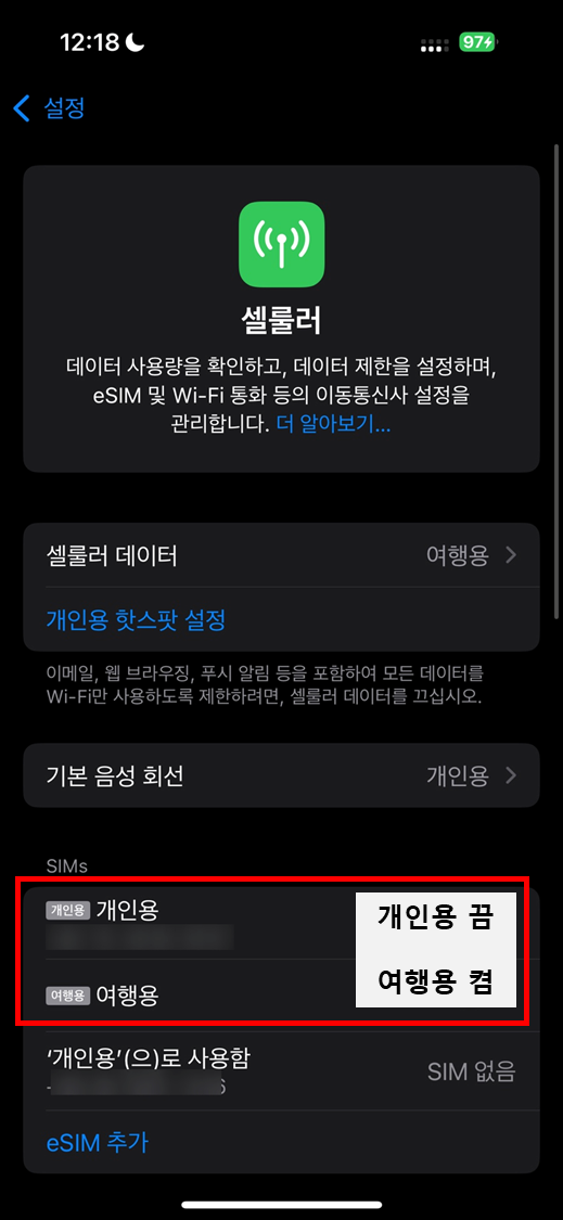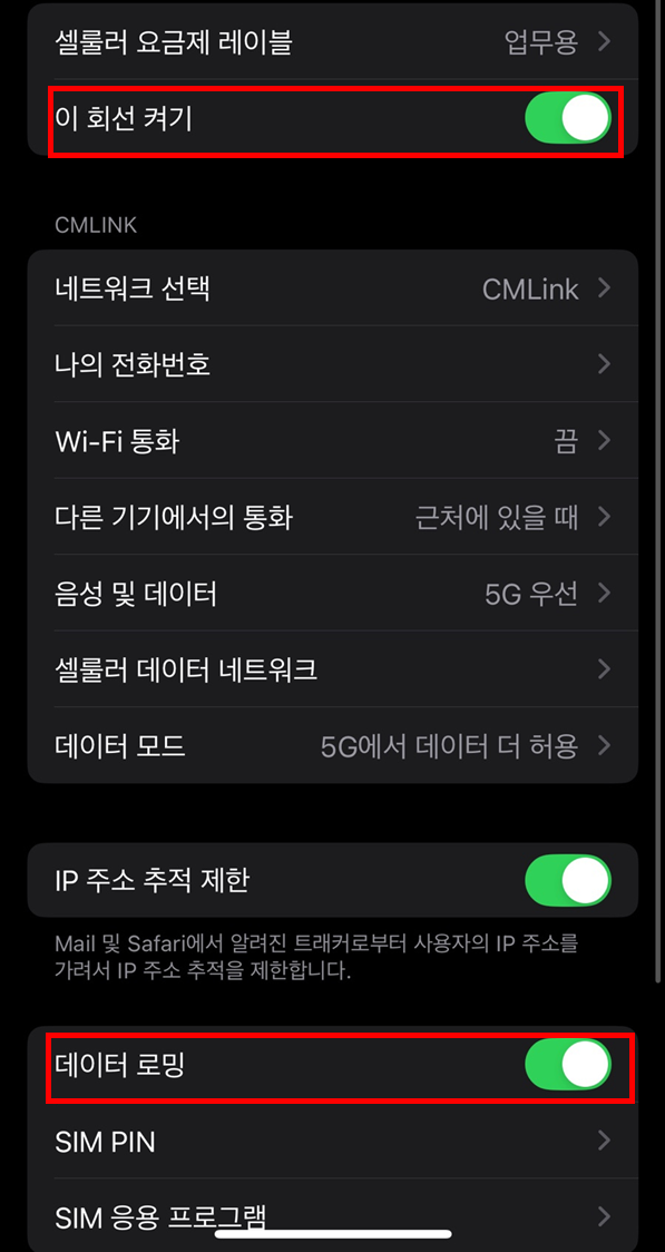 여기서 중요한 일!데이터로밍을 'ON'으로 해놔야 현지에서 데이터 이용가능하다.