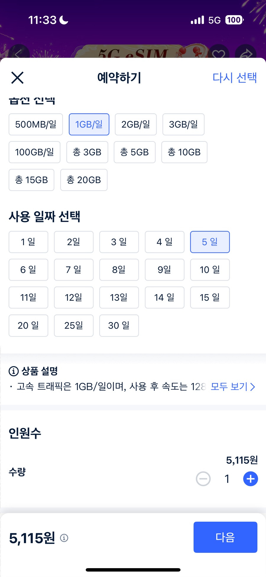 일1GB로 정하고 여행기간 5일로 정했다. 5일동안 일1GB데이터를 쓰고 그 이후는 저속으로 데이터 무제한이라니