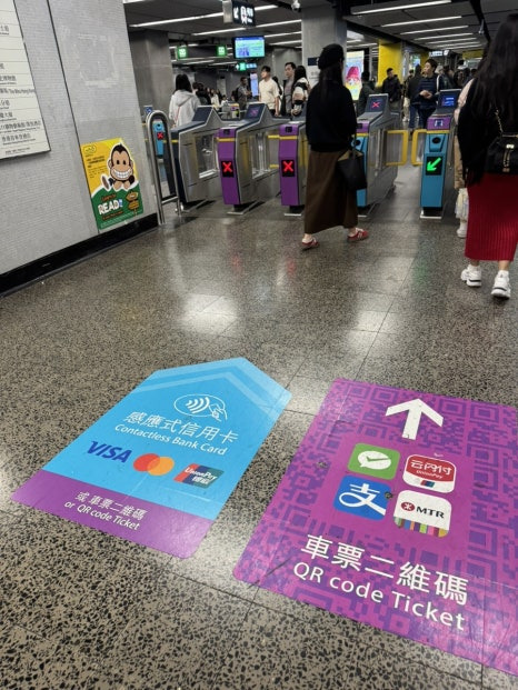 여긴 홍콩MTR 침사추이역이다. 개찰구쪽에 VISA, 마스터카드, 유니온페이 Contactless Bank Card라고 표시된 개찰구에서만 카드사용이 가능하더라. 정말 신기했던게 컨택리스 표시되어있는 카드를 띡하고 스캔하니 바로 통과할 수 있었다.ㅎㅎㅎ