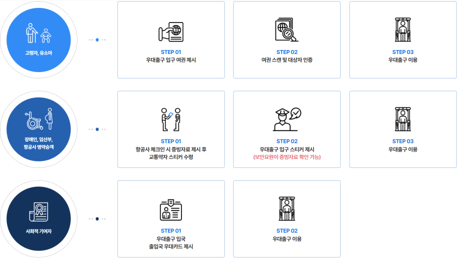 항공사 체크인 카운터에서 임산부임을 확인받고 '교통약자우대카드(스티커)'를 받아 교통약자우대 전용 출국장을 이용한다.